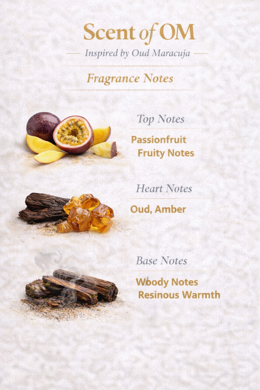 Inspired by the unique character of Oud Maracuja, Scent of OM blends fruity brightness with deep woody richness, while maintaining SCENTCO’s refined craftsmanship. Ideal for evenings, cooler seasons, and statement wear, this fragrance is unisex, adventurous, and unmistakably luxurious.